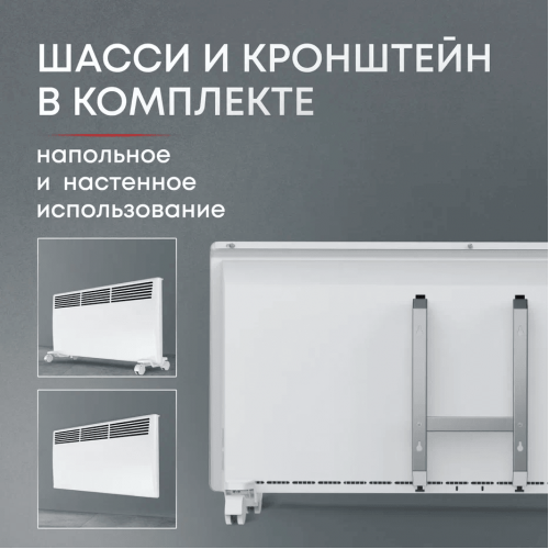 Zeder 15EX-01 предлагает пользователю несколько вариантов установки. В комплекте с устройством поставляются шасси для напольной установки и кронштейны для настенного монтажа. Это позволяет вам выбрать наиболее удобный и эффективный способ размещения конвектора в зависимости от особенностей вашего помещения.